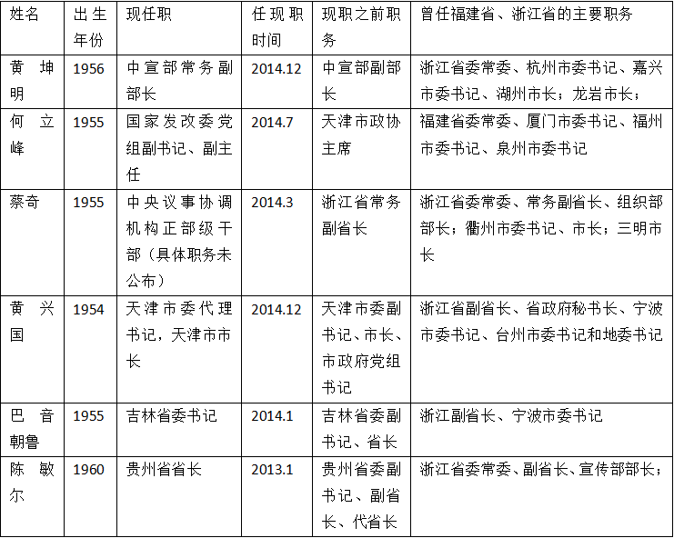 黄坤明曾有在福建、浙江两省工作的经历。现任最高领导人在福建、浙江两省工作期间,与其有工作上的交集。据智谷趋势统计,与黄坤明情况类似经历的官员,升迁到正部级及以上的至少有十人。除现仍在闽、浙两省任职的夏宝龙、李强、乔传秀、张昌平四人外,其余六人均在中央部委或其他省份得到升迁,情形如下:
