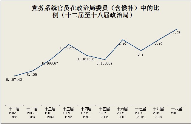 由上图可以看出,无论政治局委员数量在增加还是减少,负责党务的官员在政治局中的数量总体来说在增加。
