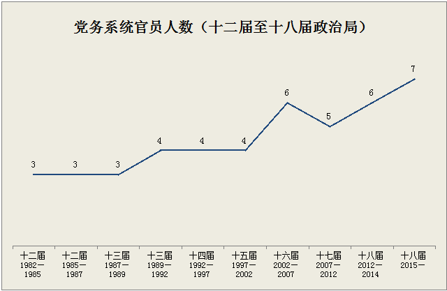 在上一届政治局的25位政治局委员中,主要负责党务工作的有5人,与在国务院系统的人数相等。而在2002年以前,政治局委员中党务官员的数量还不如国务院组成人员的数量。